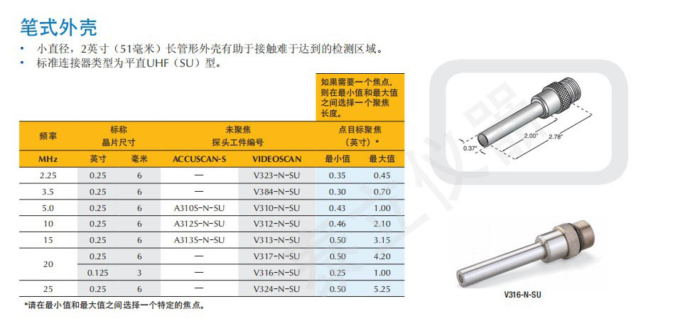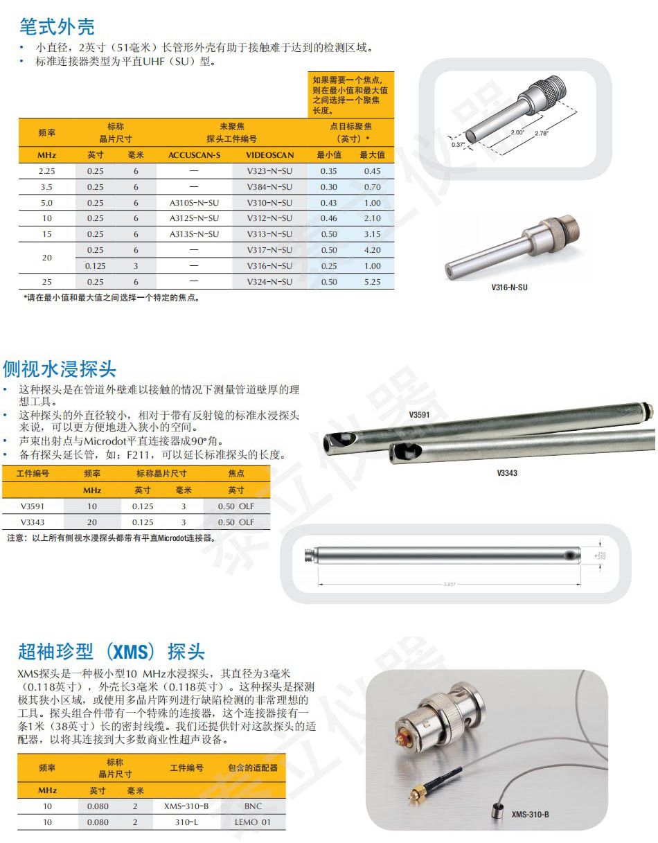 特殊水浸式探頭是指可進(jìn)行多種特定應(yīng)用的各種探頭,這些應(yīng)用如:測(cè)量壁厚、檢測(cè)鍍鋁層,或多晶片陣列缺陷探測(cè)。這些探頭包含以下類型:側(cè)視外殼、筆刷式、i-R型和XMS。
